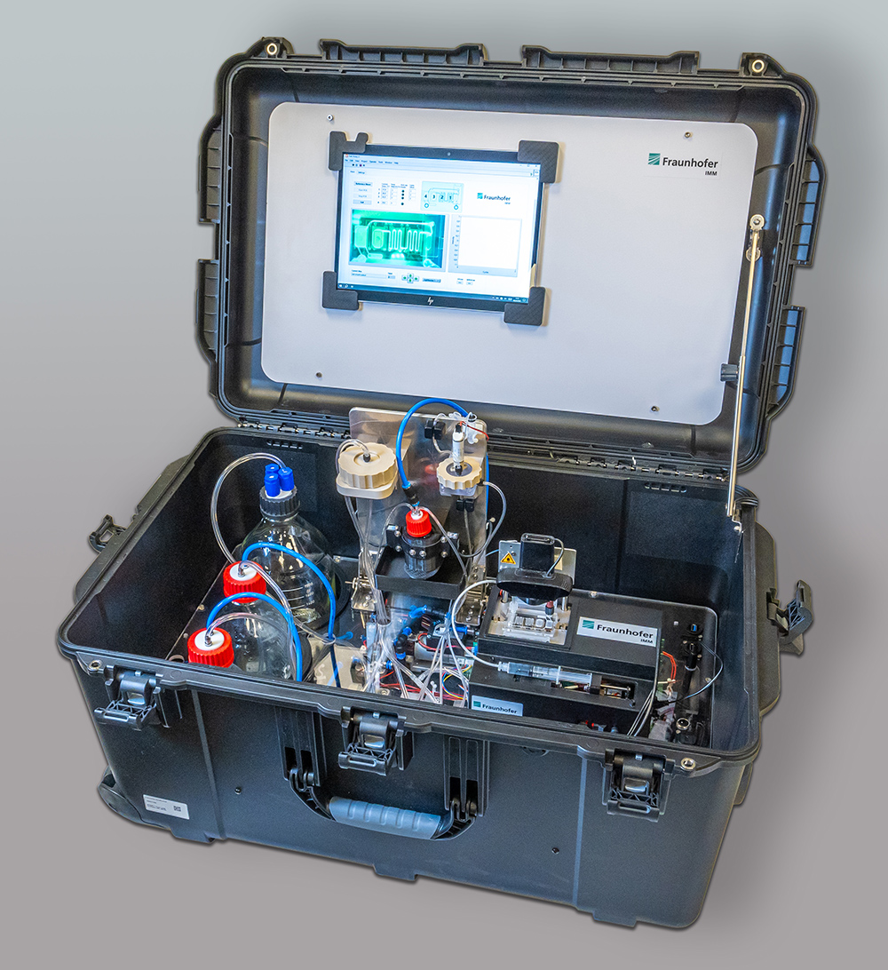 The Fraunhofer IMM's own InBaDtec platform meets the requirements mentioned above. Designed as a modular system, it consists of an ultra-fast qPCR (quantitative polymerase chain reaction) detection module as well as individually combinable modules that can represent various steps of pre-treatment in miniature form. Both the individual modules and the resulting overall system can be flexibly adapted to the specific requirements of the user. The result is an automated Point-of-Use (PoU) device that enables complete analytics in less than an hour - from the sample to the result.